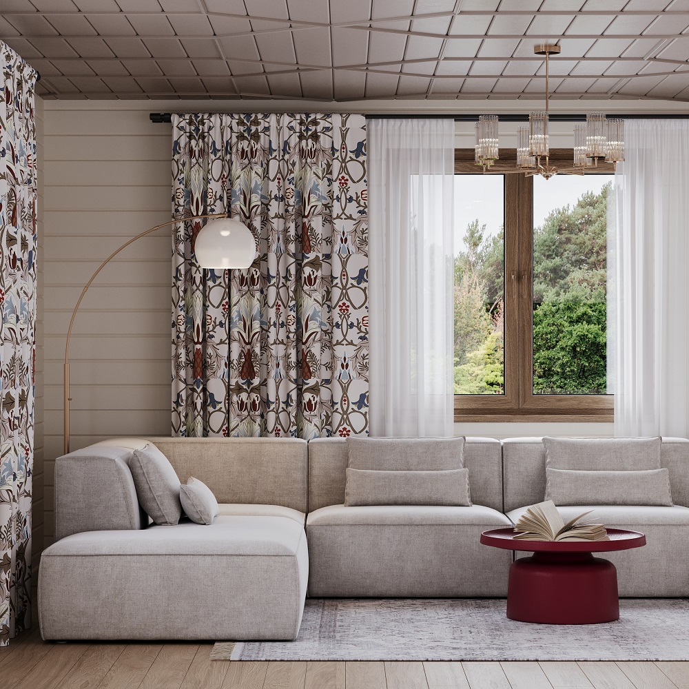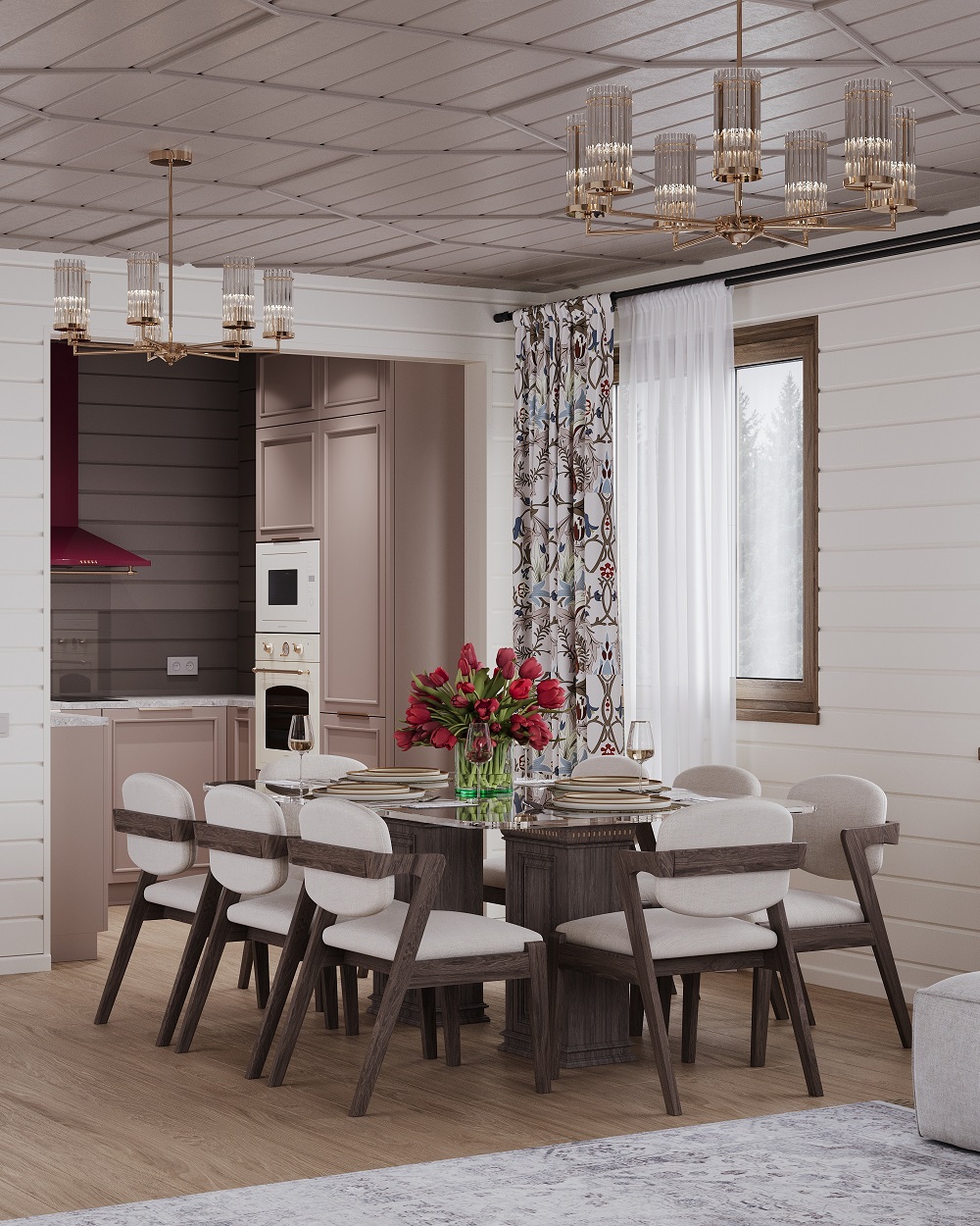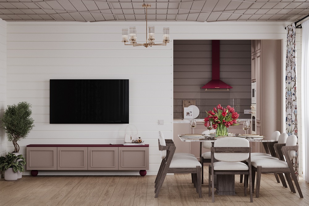1 этаж: гостиная (кухонный гарнитур, электроплита с духовкой, холодильник, стол и стулья на 6 персон, телевизор, уголок отдыха); санузел (раковина, унитаз); спальня (двухместная кровать, шкаф, тумбы, туалетный столик с зеркалом, телевизор, санузел+биде).